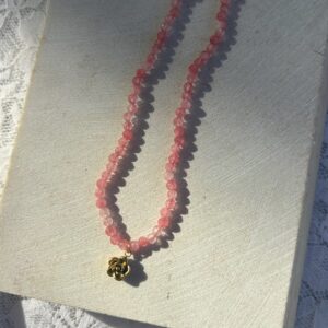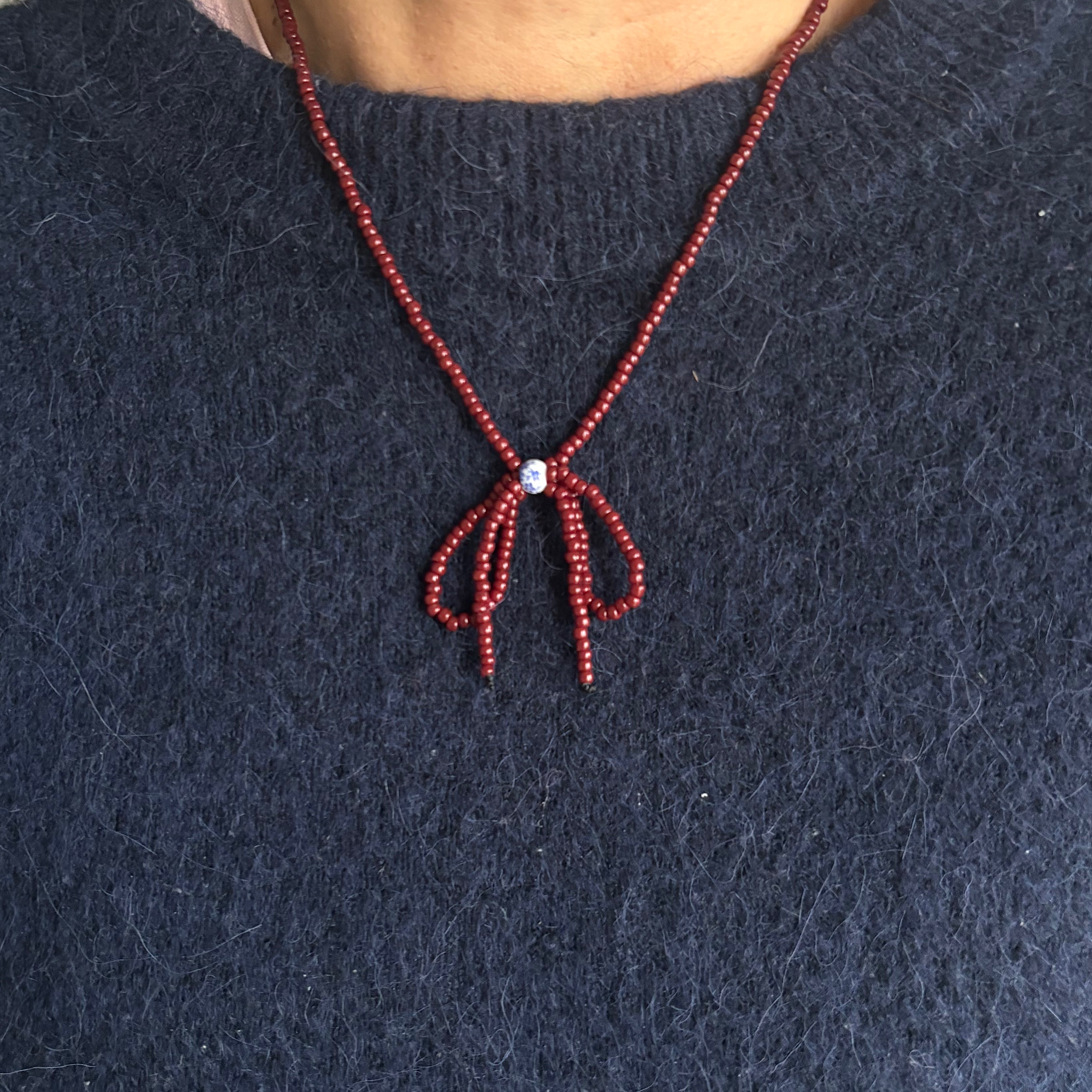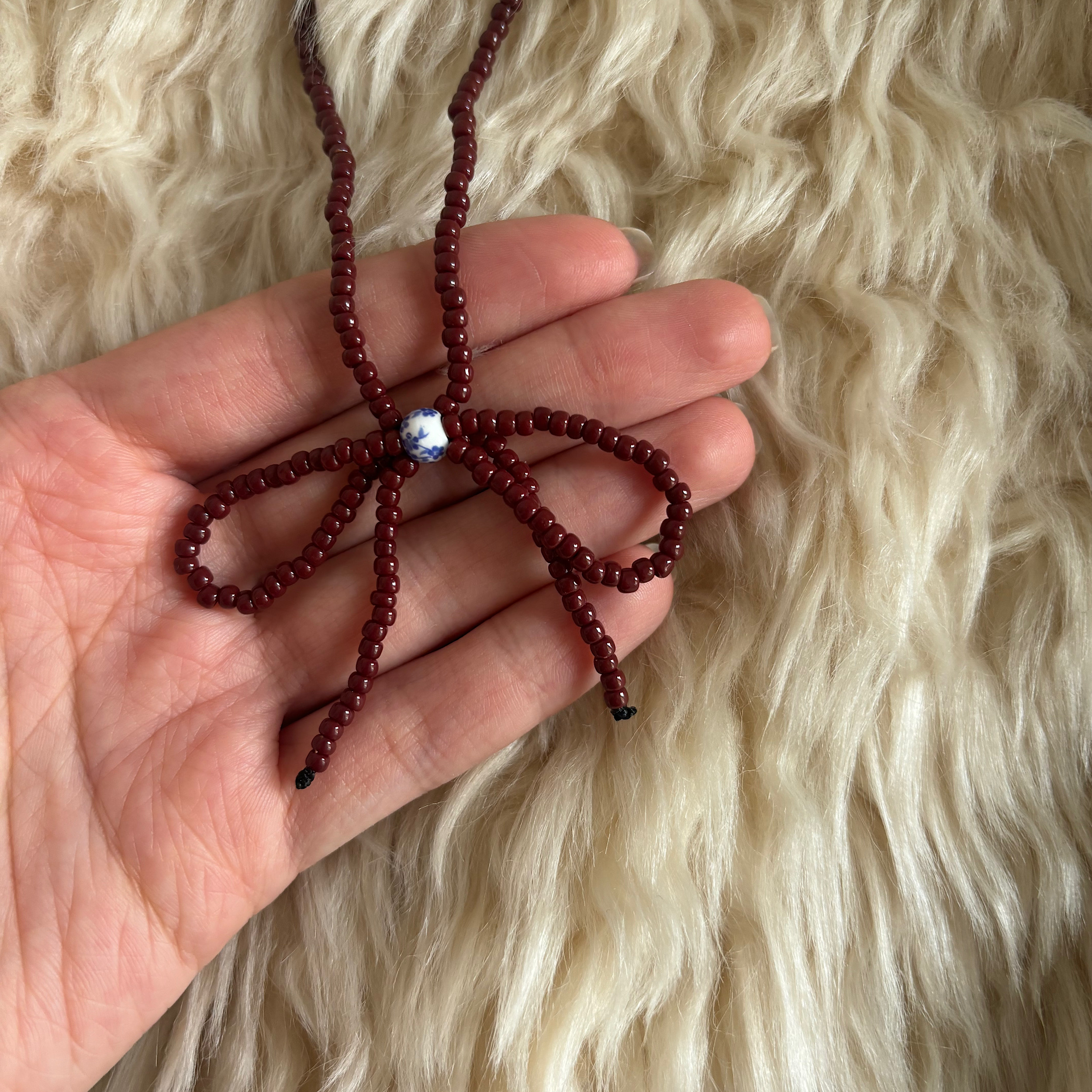 Naszyjnik wykonany ze szklanych koralików w brązowym kolorze, ręcznie zapleciona kokarda ୨୧