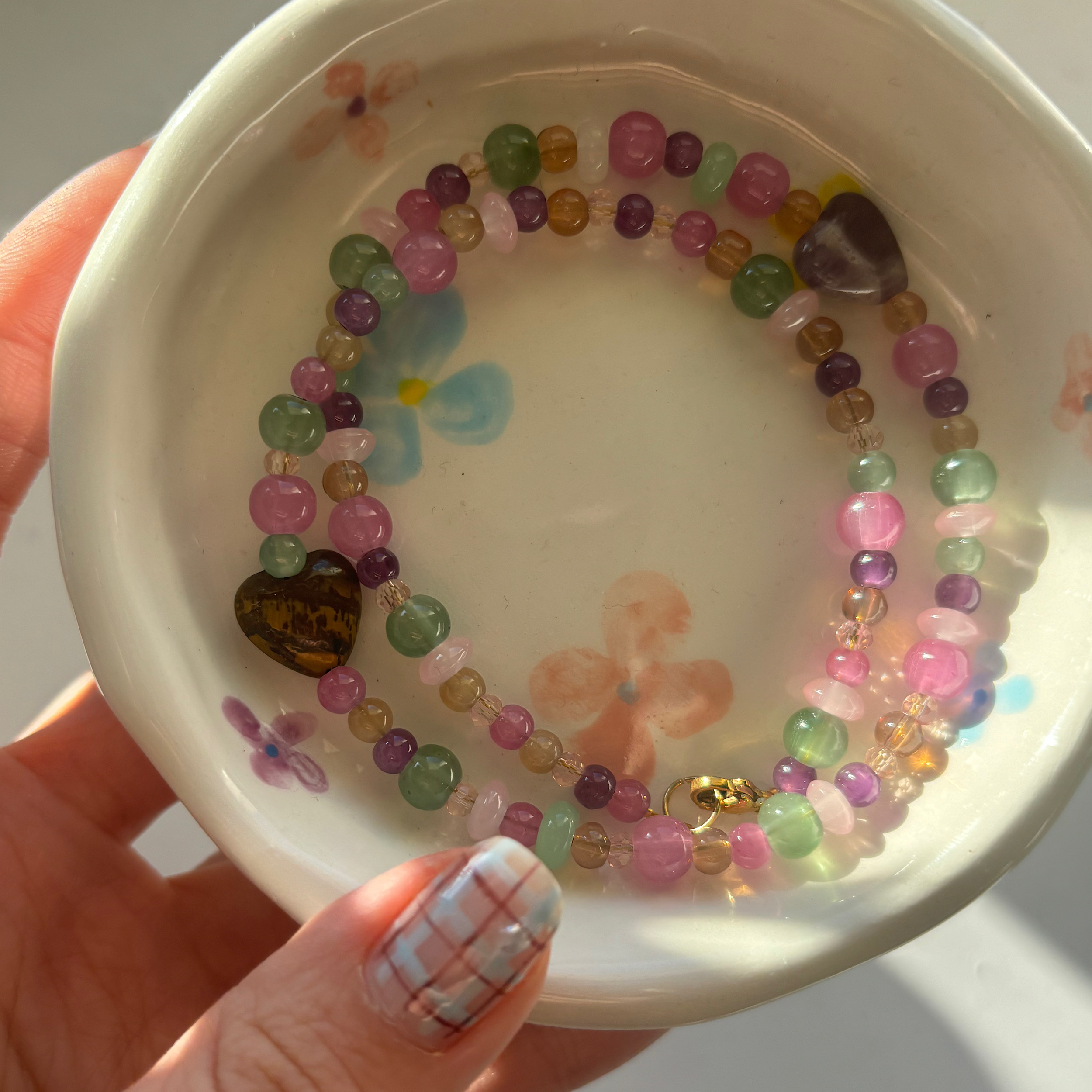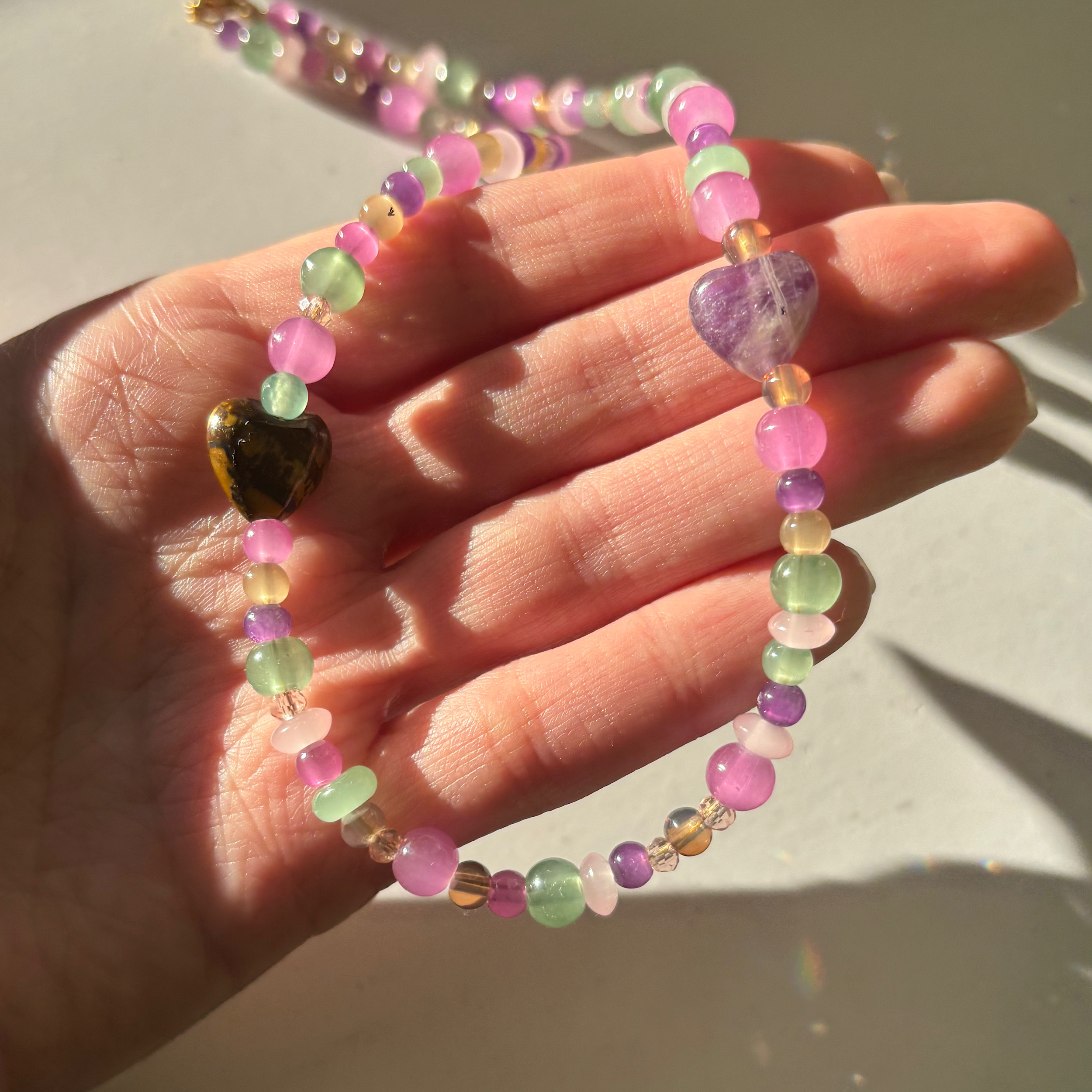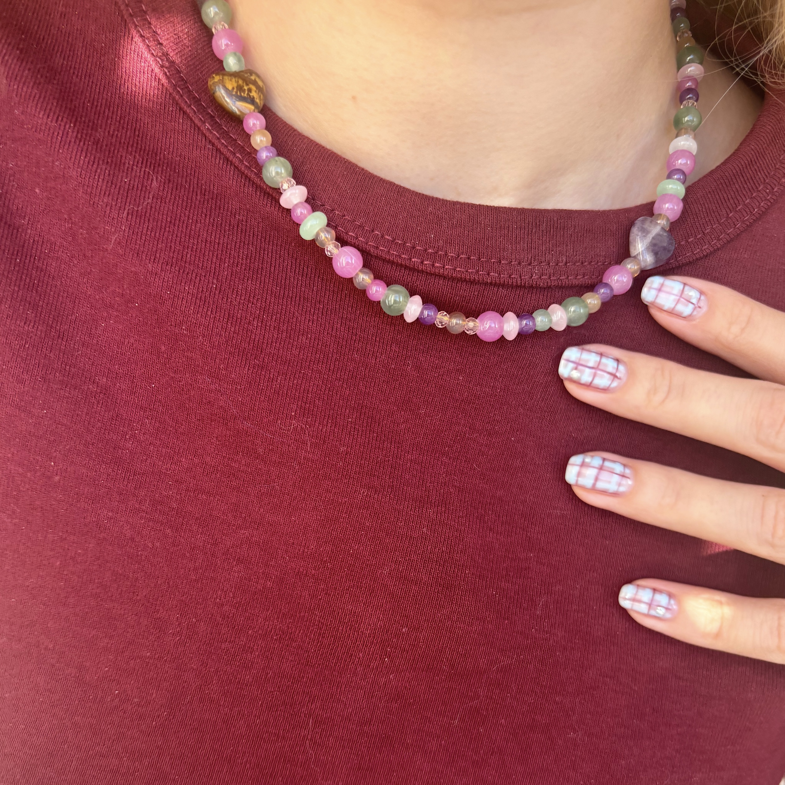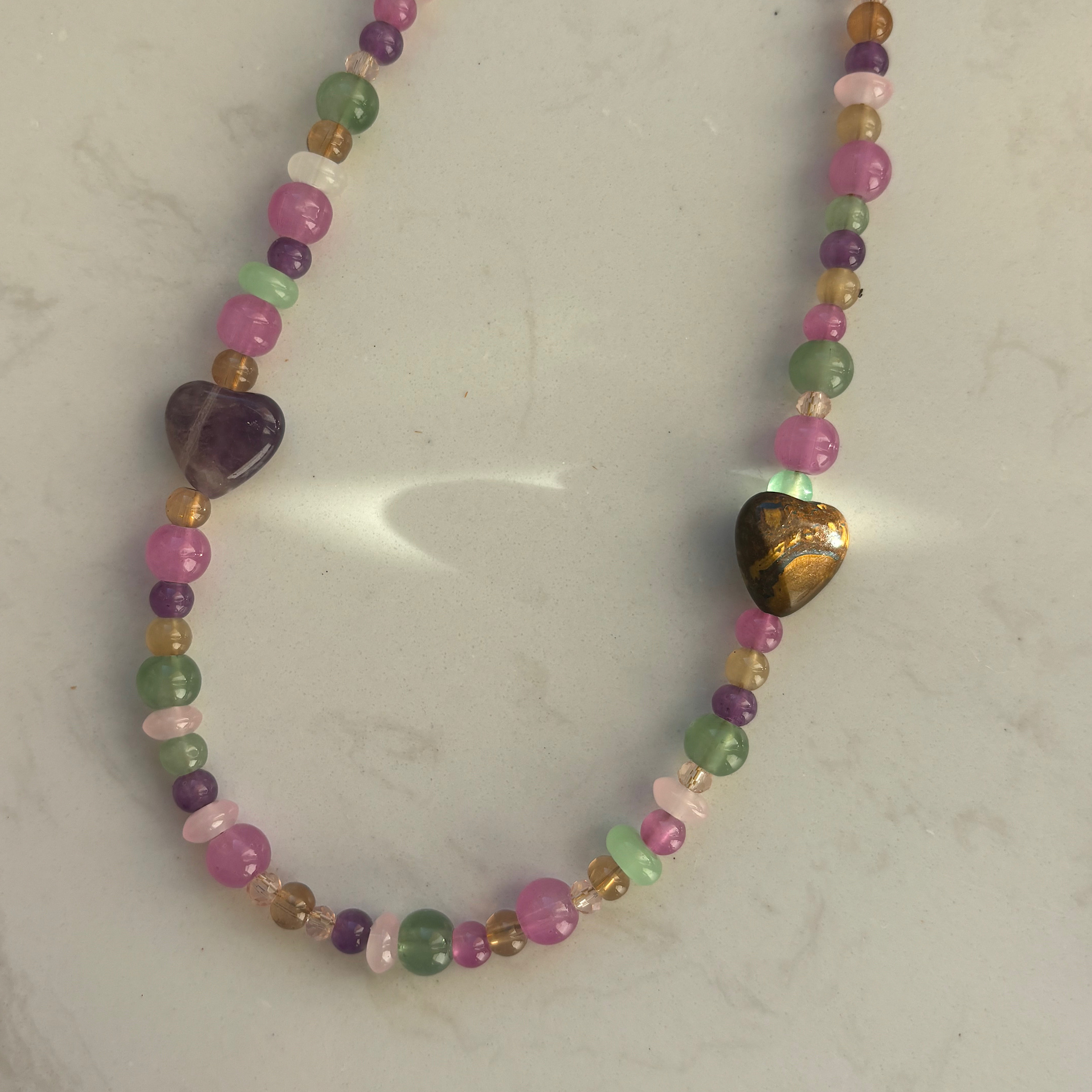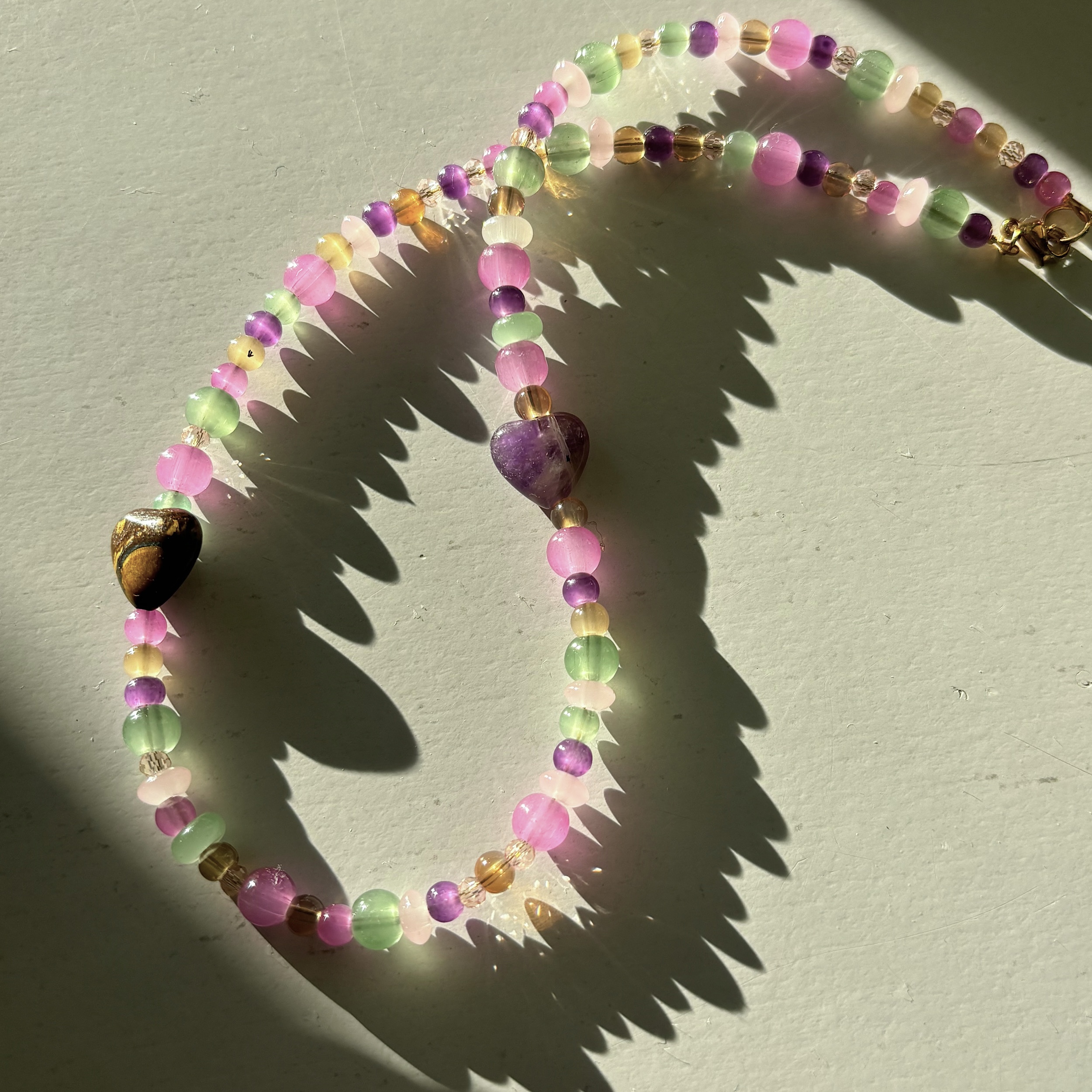 Naszyjnik wykonany ze szklanych koralików w fioletowych, zielonych i brązowych kolorach, zawieszki serca z naturalnego kamienia.