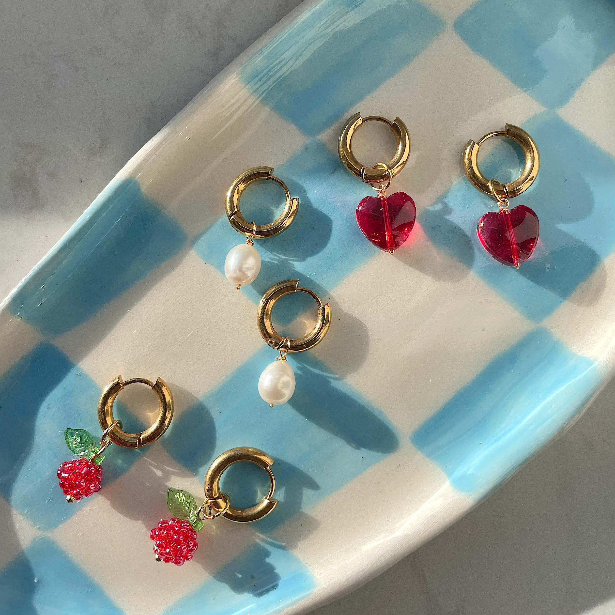 Kolczyki ze szklanymi zawieszkami w kształcie serc.