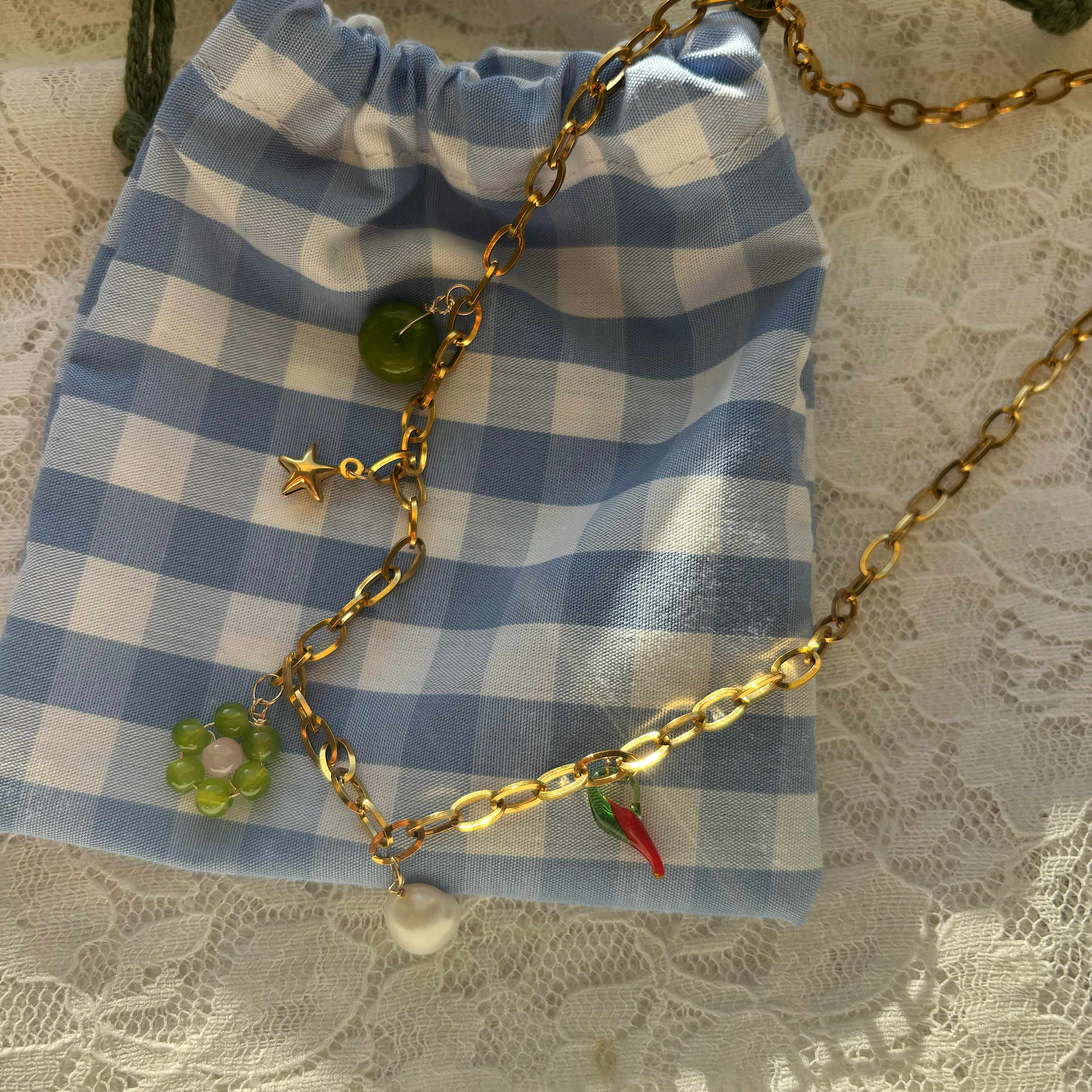 W zestawie woreczek na biżuterię, uszyty przez nas ręcznie.