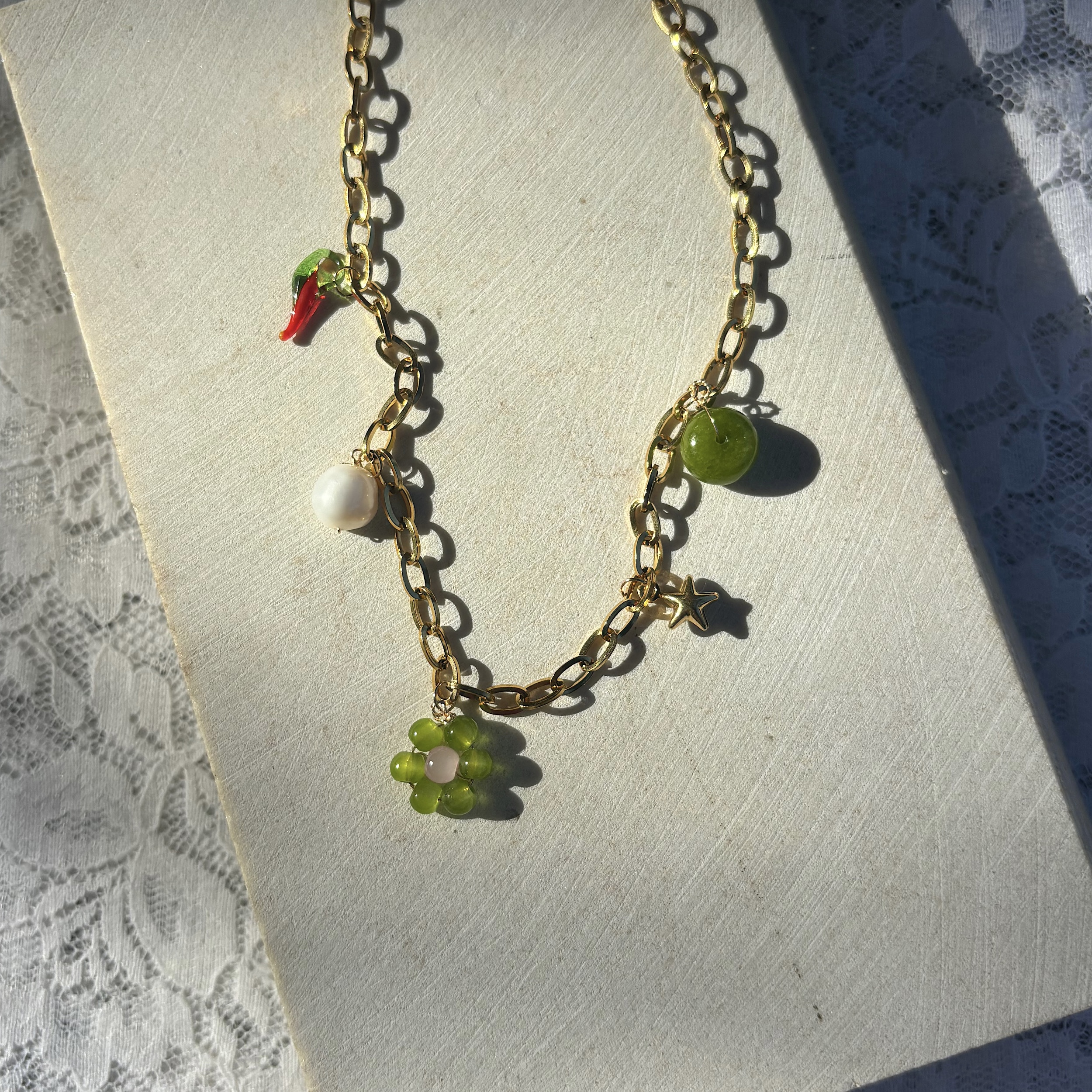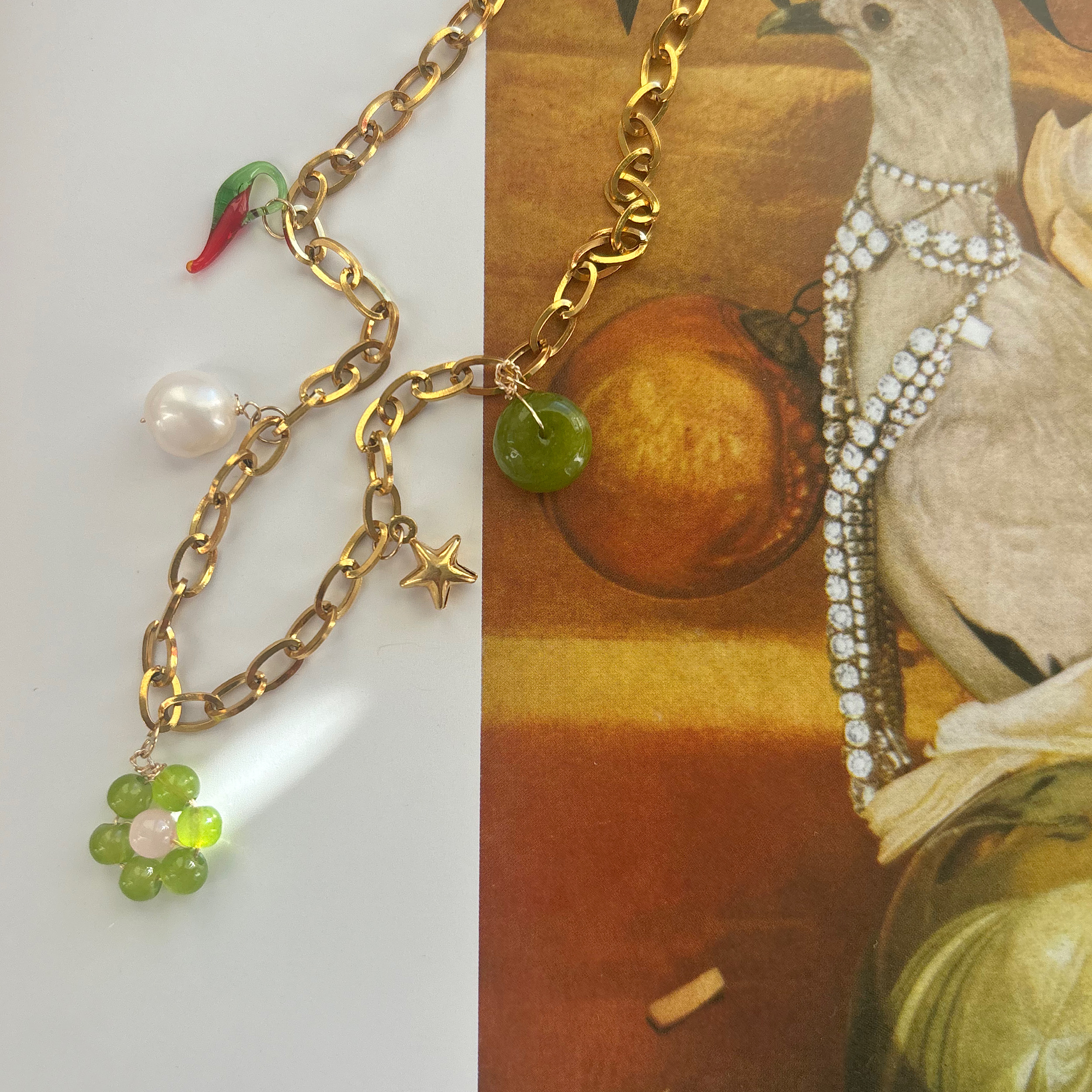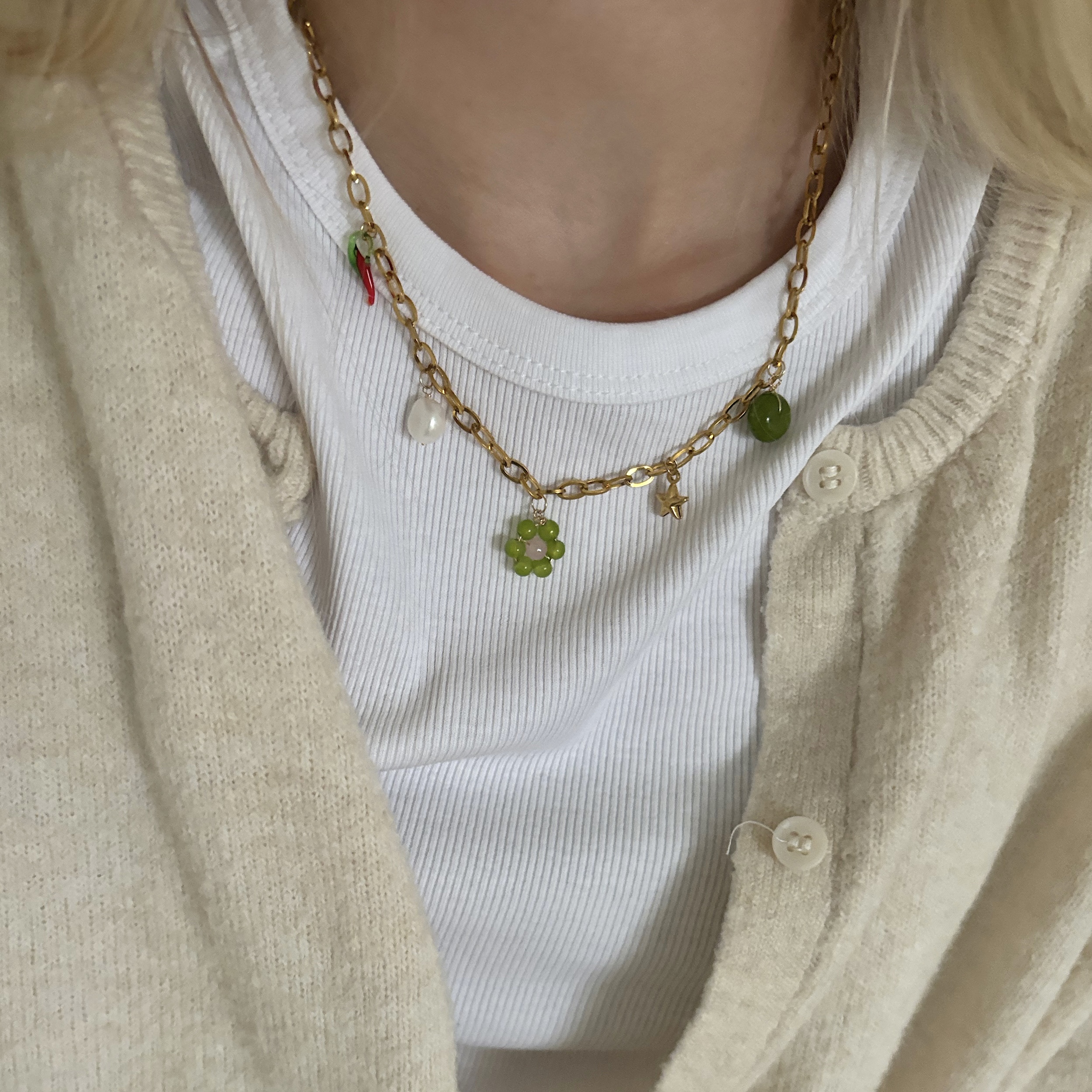 Wykonany ze stali szlachetnej, zawieszki- koraliki szklane, stal szlachetna, szkło, perła słodkowodna.