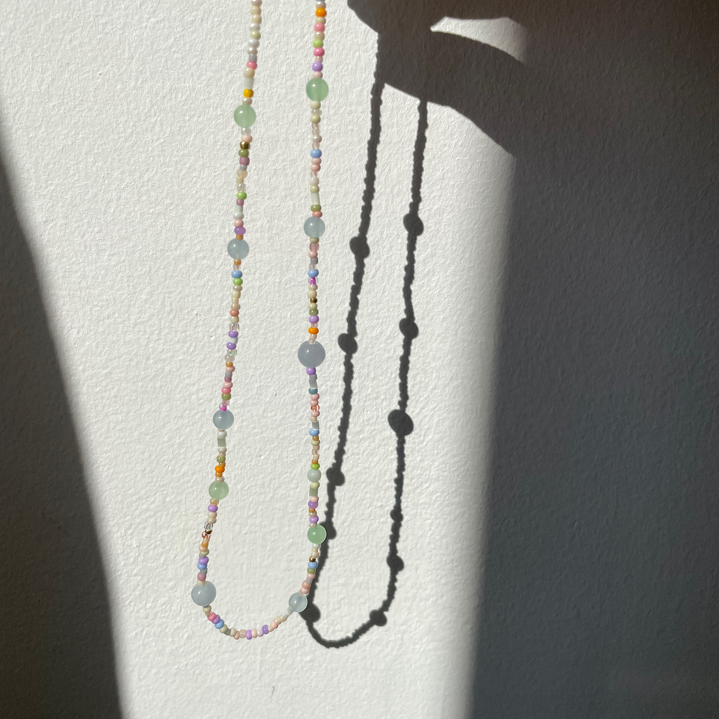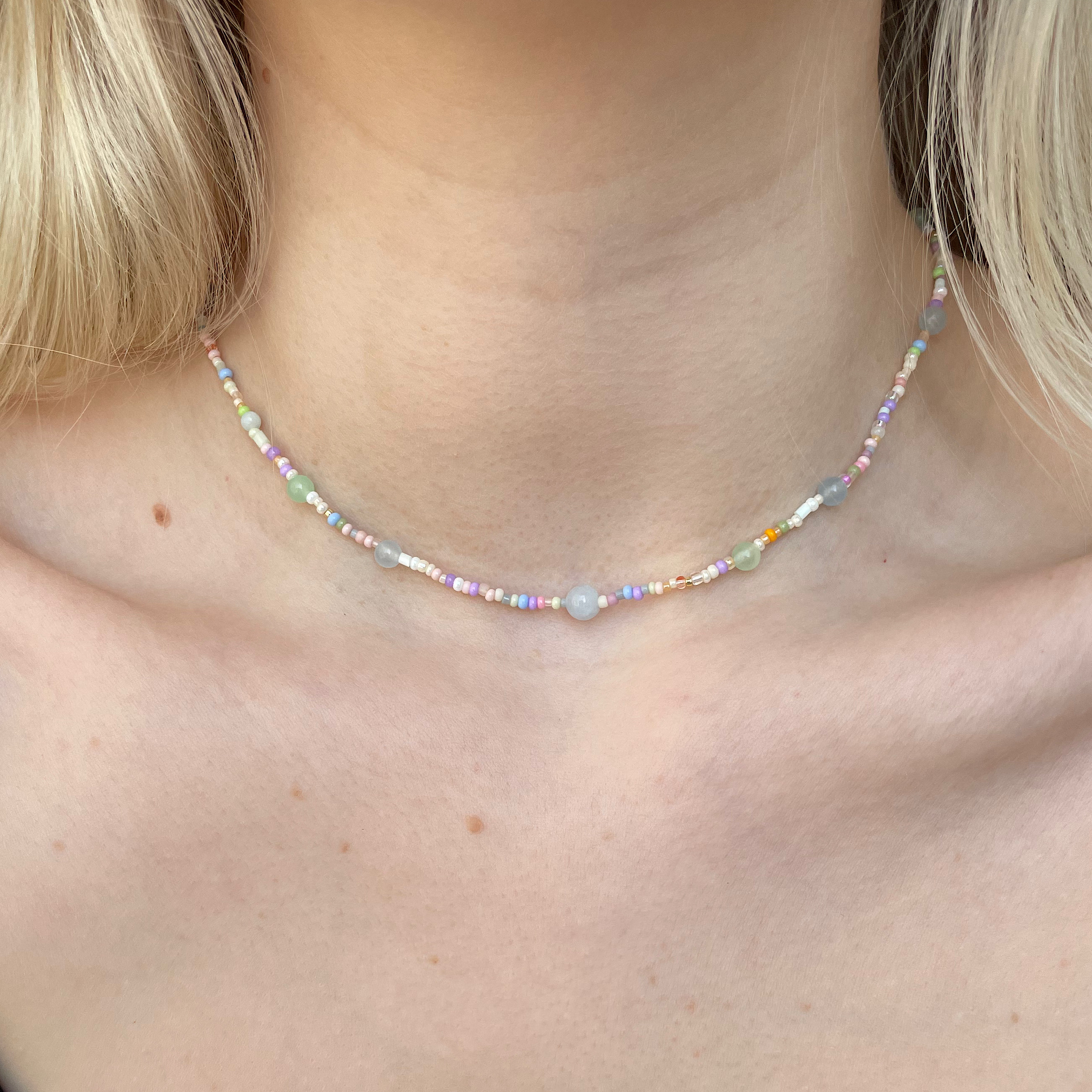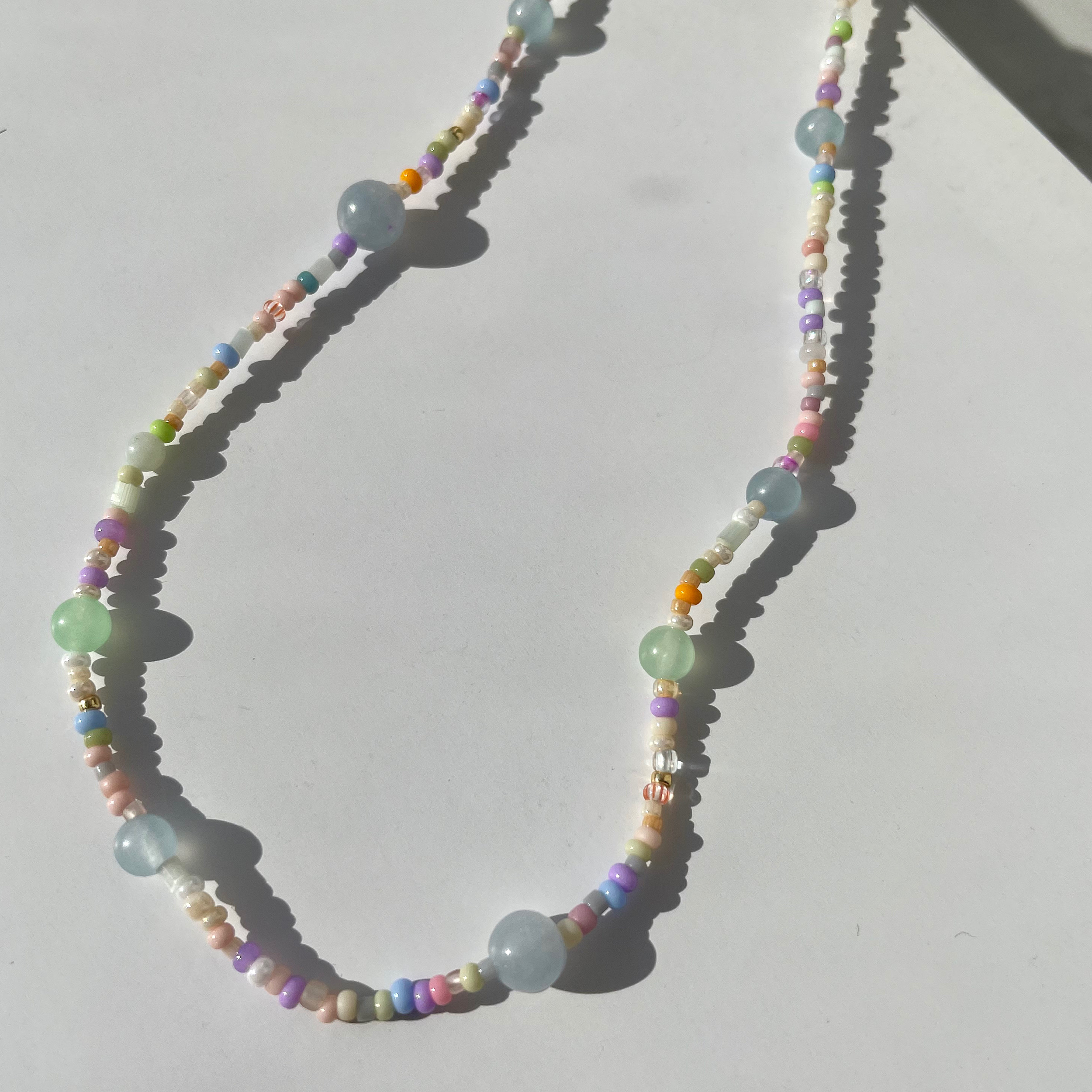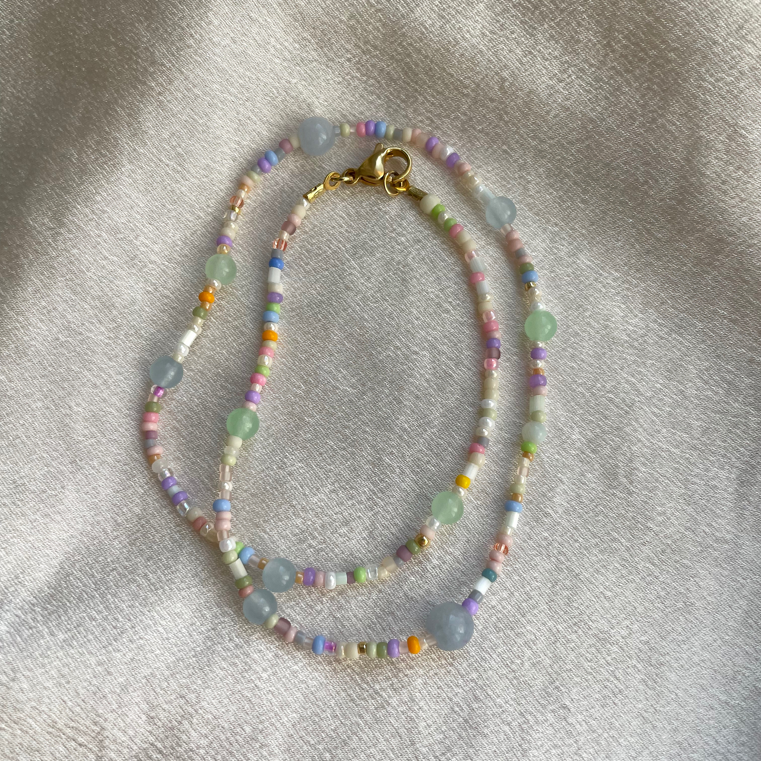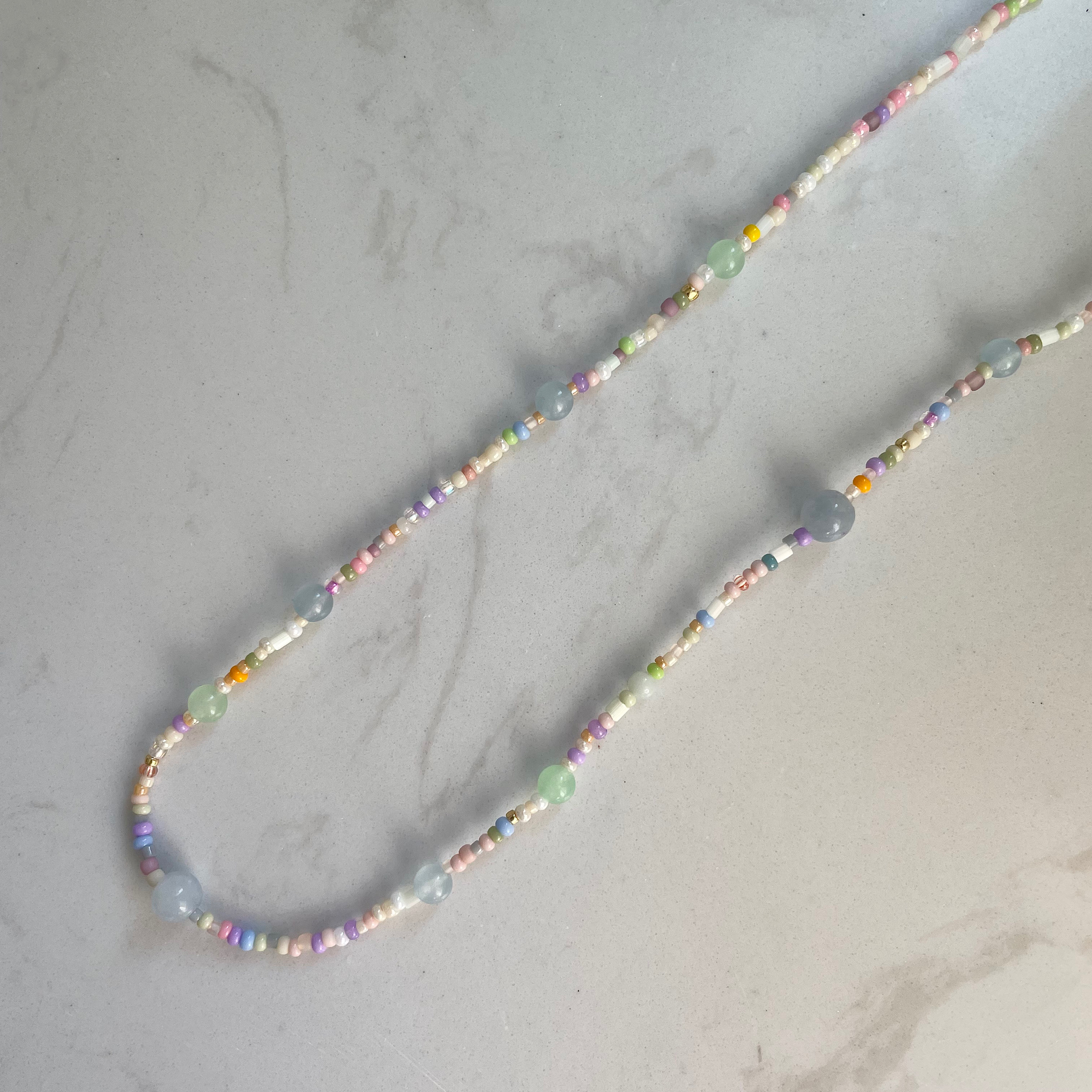 Naszyjnik wykonany z pastelowych koralików i jadeitu.