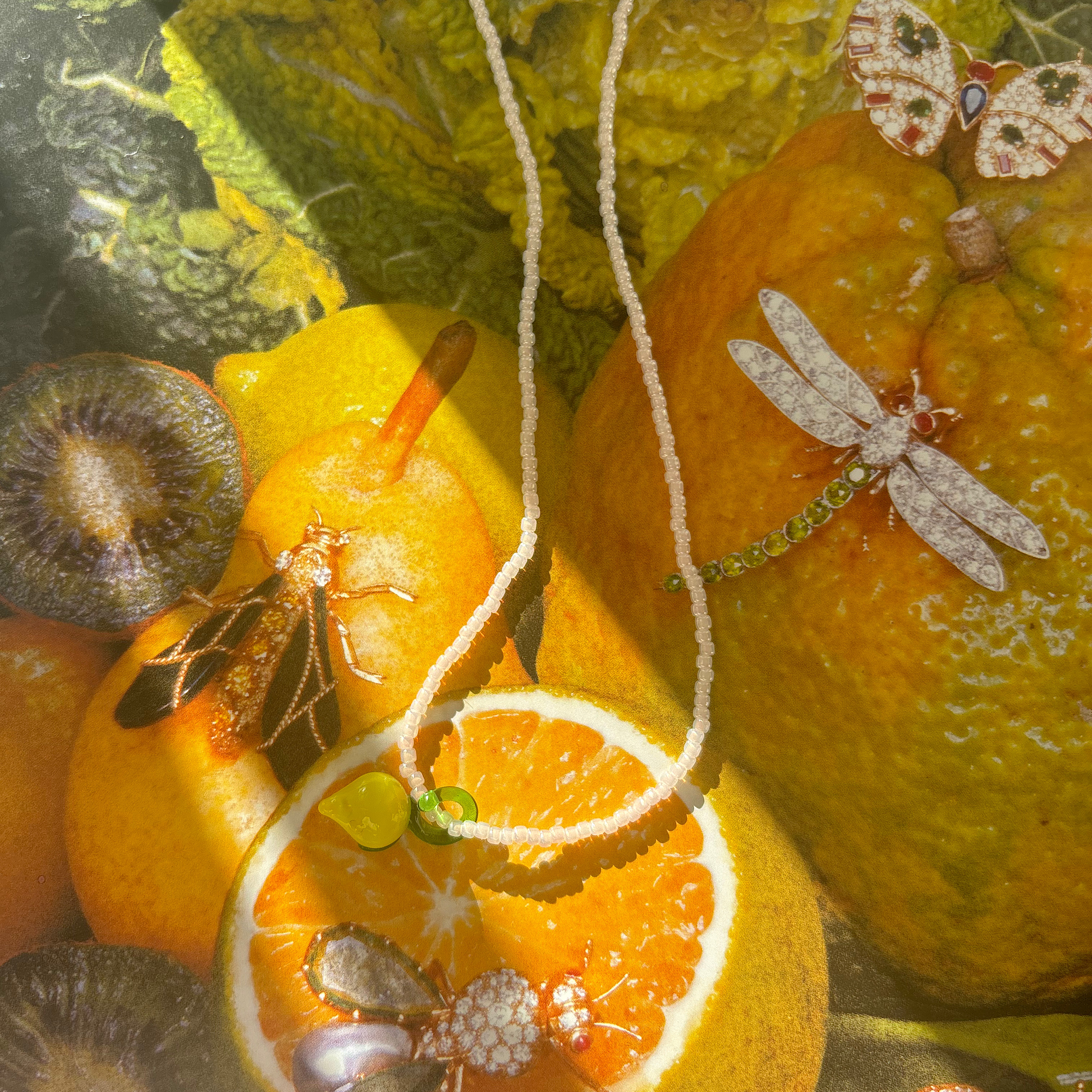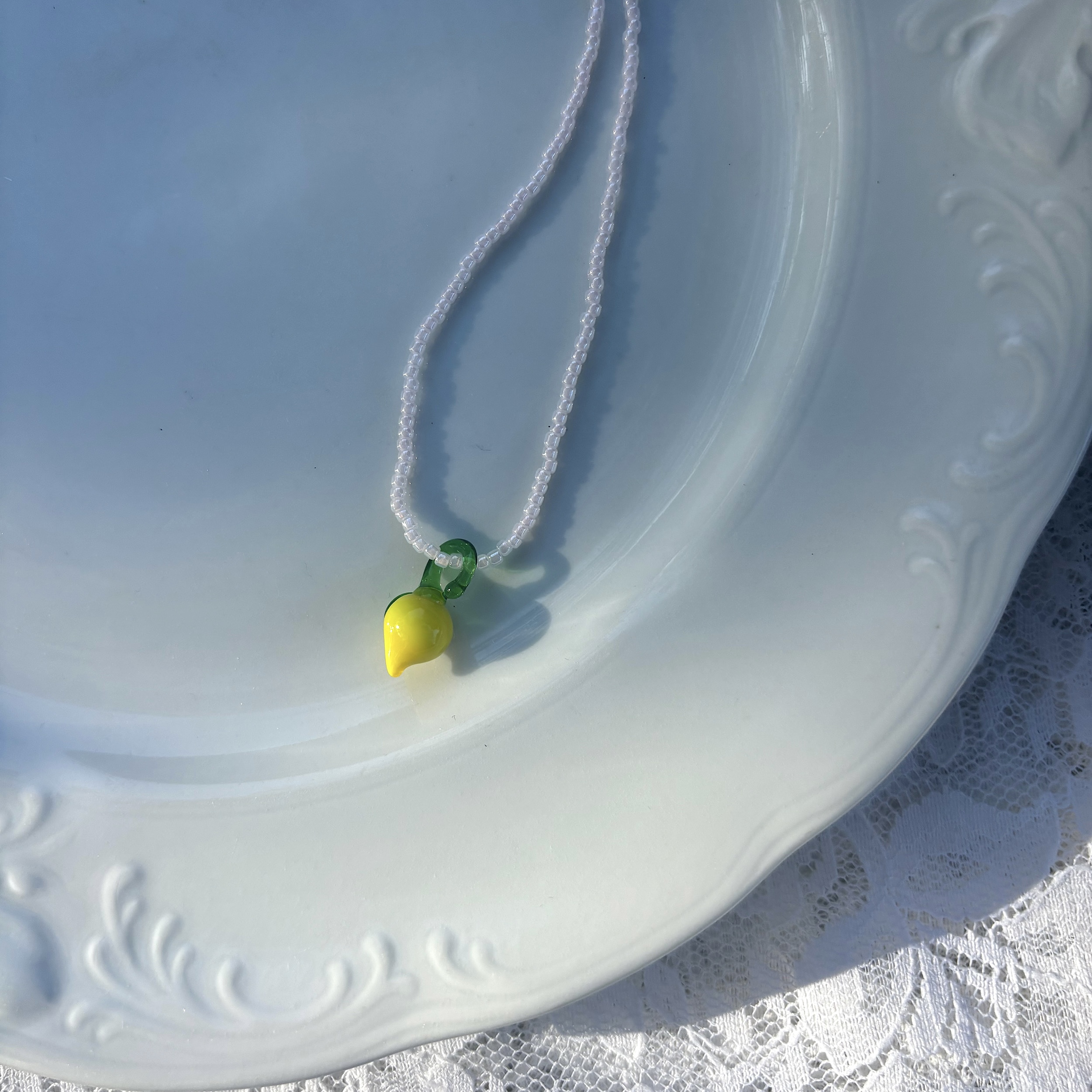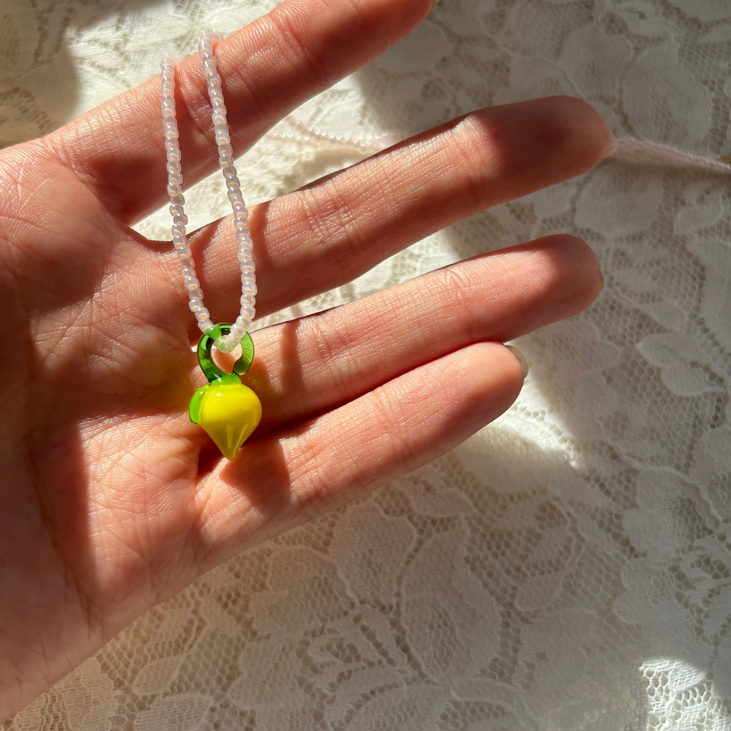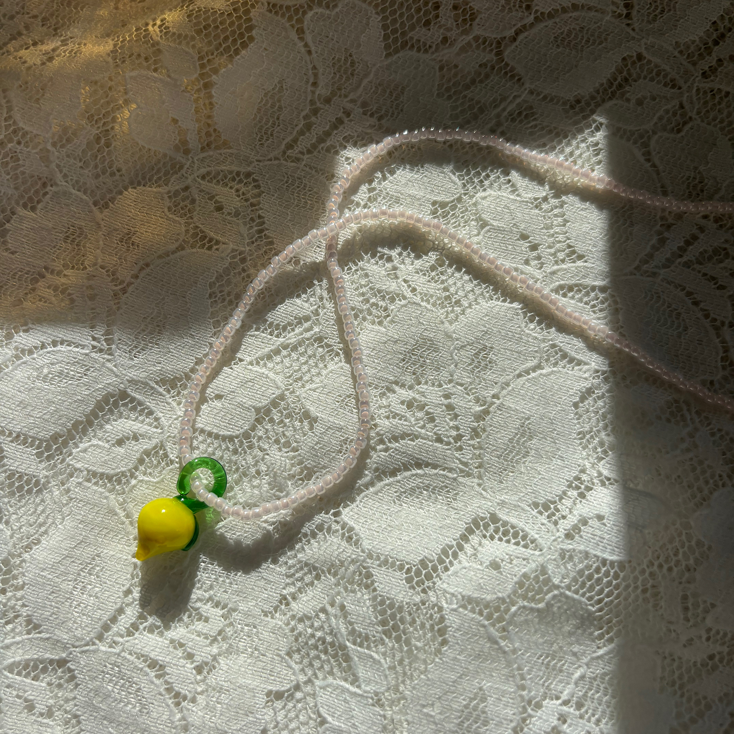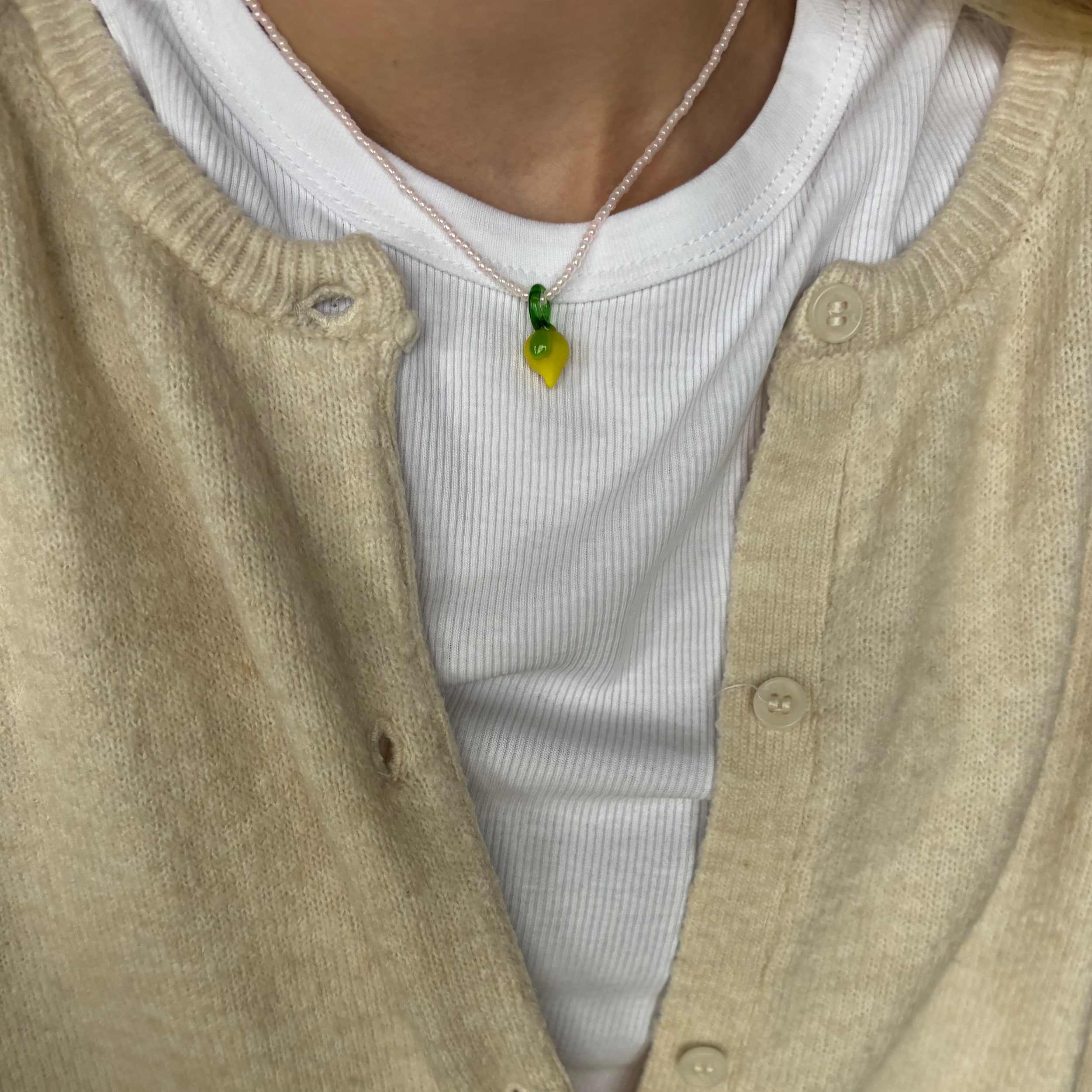 Naszyjnik wykonany z drobnych, szklanych koralików w perłowym kolorze, szklana zawieszka cytrynka.